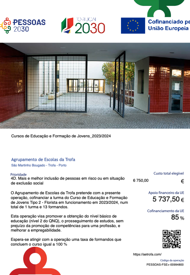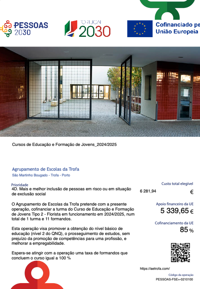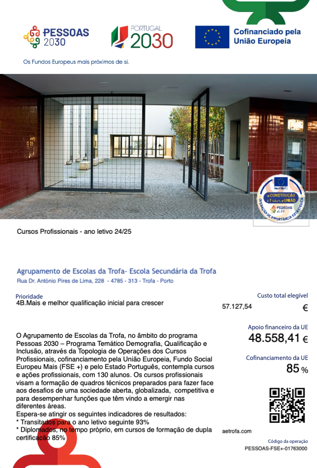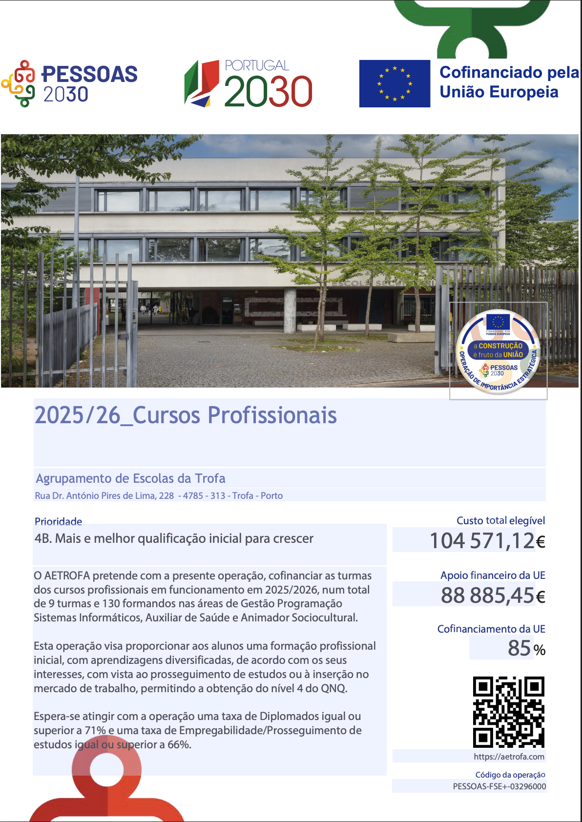 O Agrupamento de Escolas da Trofa oferece cursos profissionais para jovens com o 9º ano, com duração de 3 anos letivos. Os cursos disponíveis são: Animador Sociocultural, Auxiliar de Saúde, Informática de Gestão e Gestão e Programação de Sistemas Informáticos.